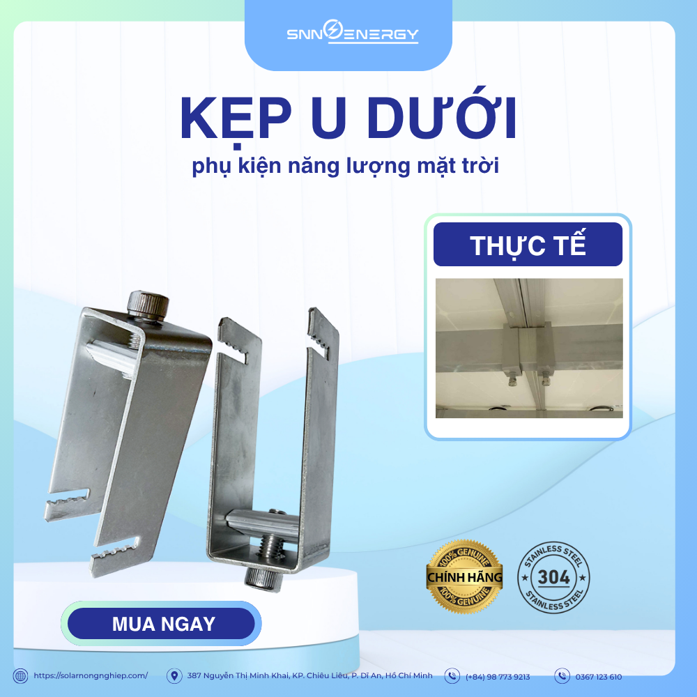 Kẹp U dưới là phụ kiện chuyên dụng trong hệ thống lắp đặt tấm pin năng lượng mặt trời, được dùng để cố định mép dưới khung pin với thanh rail hoặc xà gồ thép.